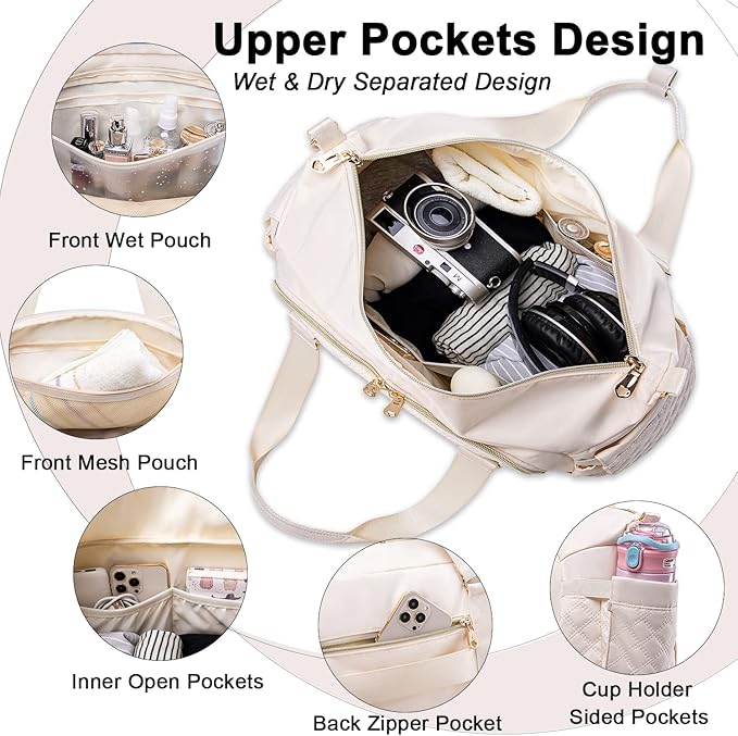 - 【Dry Wet Separated Gym Bag】This Gym Bag For Women Features A Dry And Wet Separation Design. The Upper Main Compartment Is Suitable For Storing Clothes, Electronics, And Books, While The Four Interior Pouches Are Well-Organized For Storing Small Items. The Travel Bag’s Front Pocket Is Designed With A Waterproof Liner, Making It Perfect For Storing Wet Towels And Toiletries While Keeping Other Items Dry.