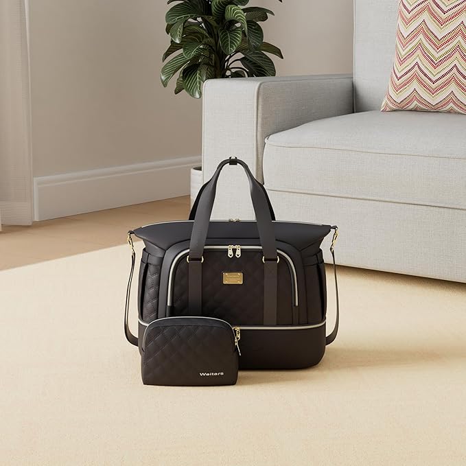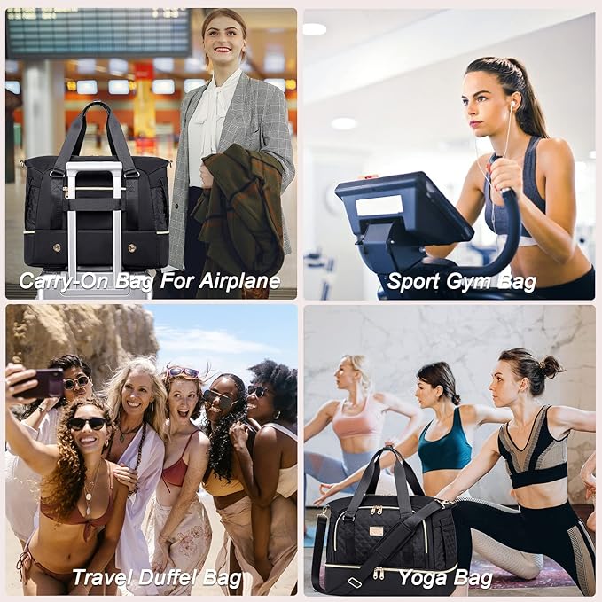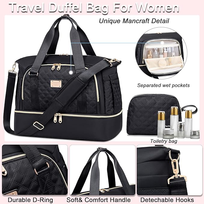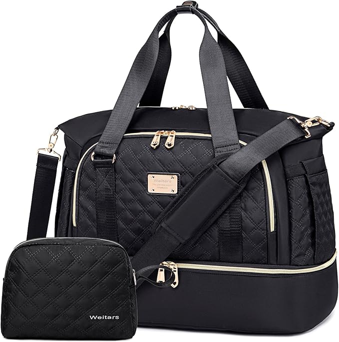 Weitars Women's Gym Duffel Bag - Travel Weekender with Shoes Compartment & Wet Pocket, Large Carry-On Overnight Bag (Black)