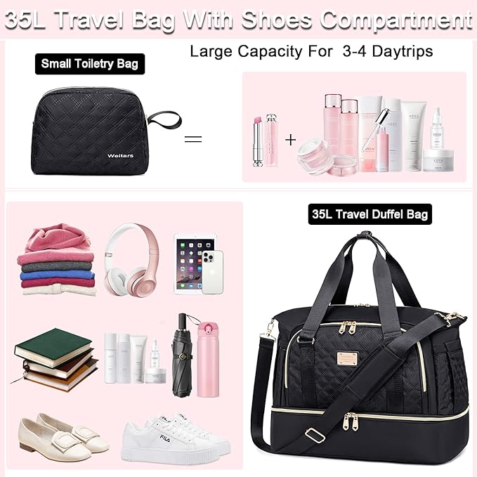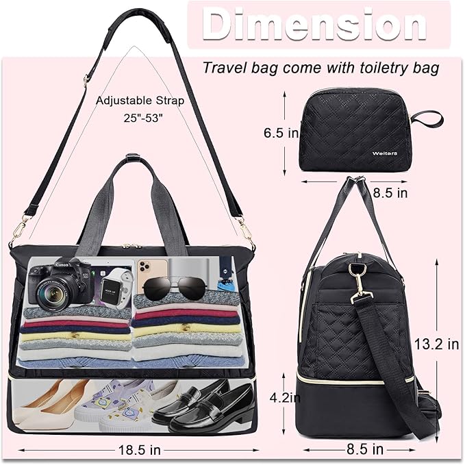 - 【Large Weekender Bag With Multi-Pockets】The Weekender Bag For Women Measure By L18.5"X W8.5"X H13.2",With Capacity Of 35L. Separated Upper And Down Compartments That Can Fit Daily Necessities For 3-5 Days,Such As Clothes,Shoes,Books,Bottles,Toiletries, Etc.The External Multi-Pocket Design Allows For Easy Organization And Access To Your Belongings,A Back Pocket For Personal Items Such As Your Phone And Wallet.Additionally,It Comes With A Toiletry Bag To Conveniently Store Your Toiletries.