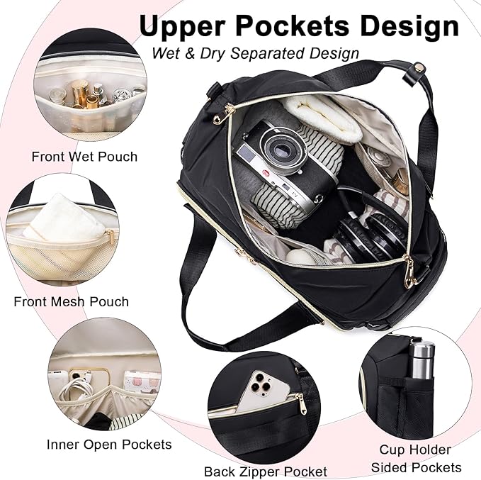 - 【Dry Wet Separated Gym Bag】This Gym Bag For Women Features A Dry And Wet Separation Design. The Upper Main Compartment Is Suitable For Storing Clothes, Electronics, And Books, While The Four Interior Pouches Are Well-Organized For Storing Small Items. The Travel Bag’s Front Pocket Is Designed With A Waterproof Liner, Making It Perfect For Storing Wet Towels And Toiletries While Keeping Other Items Dry.