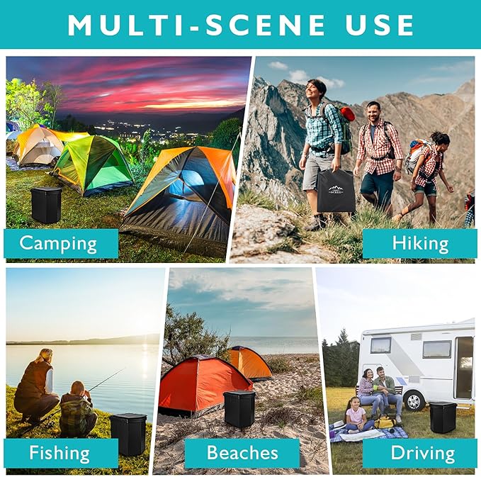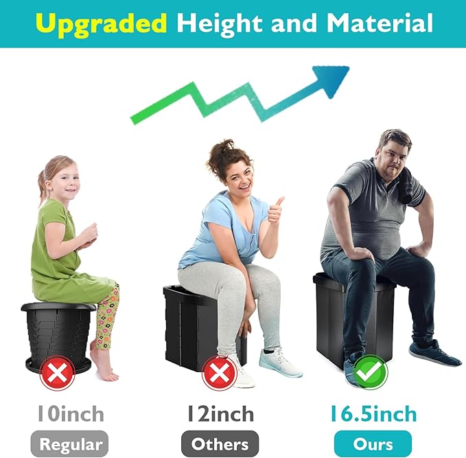 - 🏕️【Upgrade Heightening Portable Toilet】Our porta potty for camping is 16.5 inches high. It's among the tallest units in its category, and this is a lifesaver if you've any knee issues; it's genuinely comfy. Versatility aside, this portable toilet for camping is built with ergonomics and user-friendliness in mind. This travel toilet caters to everyone's needs at any time and is the best choice for camping , hiking, long trips traffic jam, roadtrip, car, popup tent, truck drivers and more.