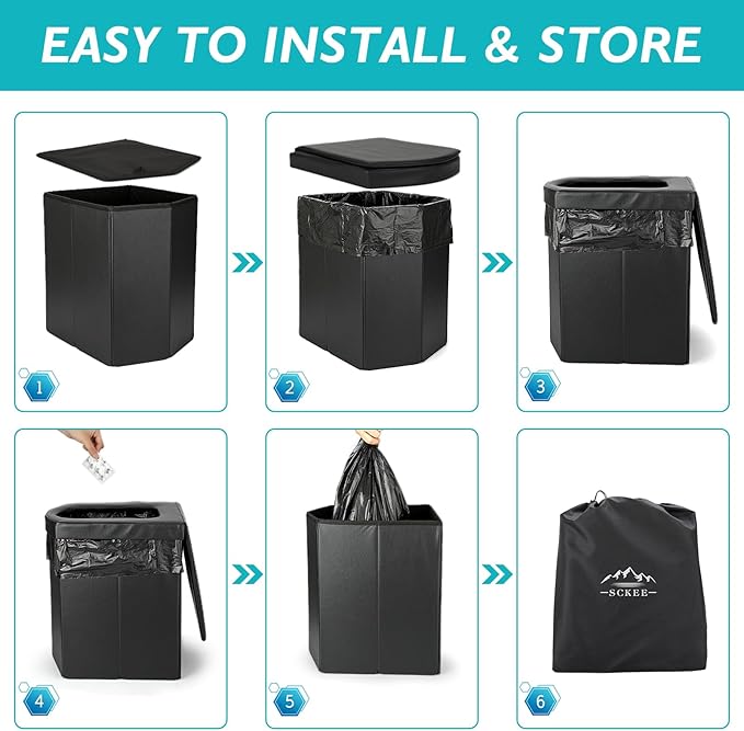 - 🏕️【Easy to Use and Clean】 This collapsible potty is one of the most compact portable toilet options, just folds down compact into a bag(included). This outdoor toilet has a lid that stays up like a regular toilet. Porta potties come with garbage bags and bio gel, which helps to solidify liquid waste. Cleanup and disposal are much easier, as a result. If you need a backup or emergency portable toilet for a long road trip or to stow away in your RV, this is a solid choice.