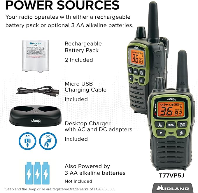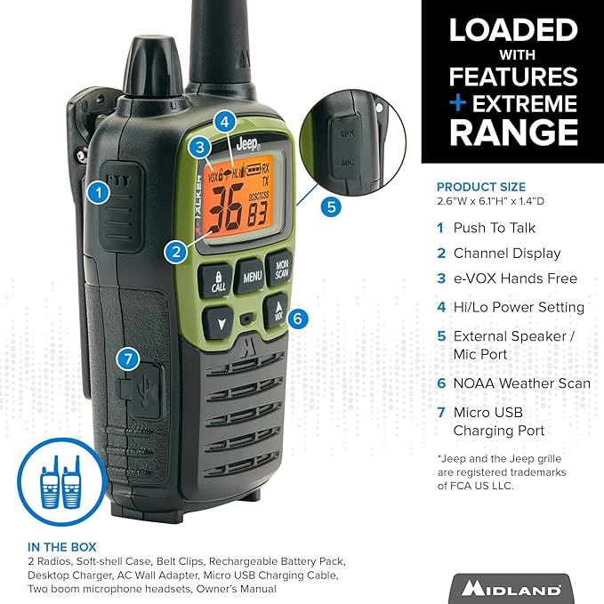 - What’s In The Box – Included in the box: pair of Jeep brand Two Way Radios, Jeep branded soft-shell case, belt clips, rechargeable battery pack, desktop charger, AC wall adapter, micro USB charging cable, two boom microphone headsets, and the owner’s manual.