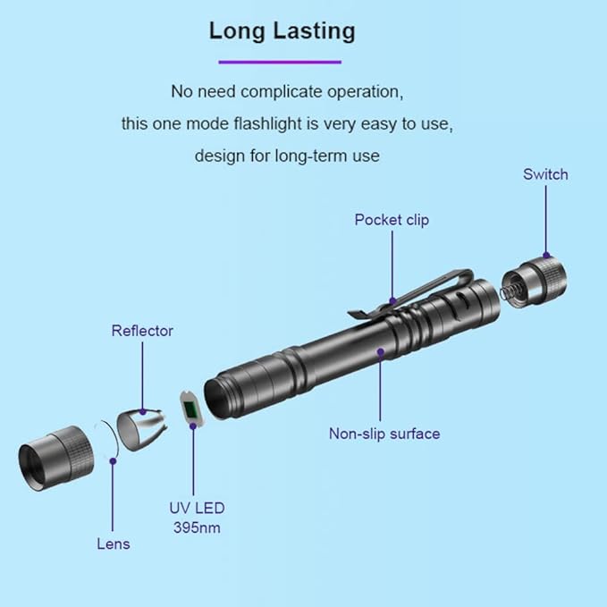 - ▶【QUALITY GUARANTEE】You will get 1*blacklight penlights, each flashlight powered by 2*AAA batteries(Not Included), Military grade aluminum material, and the portable design make our black light perfect gift choice for family, friends and pet-lovers. 90-Day Money Back Guarantee.