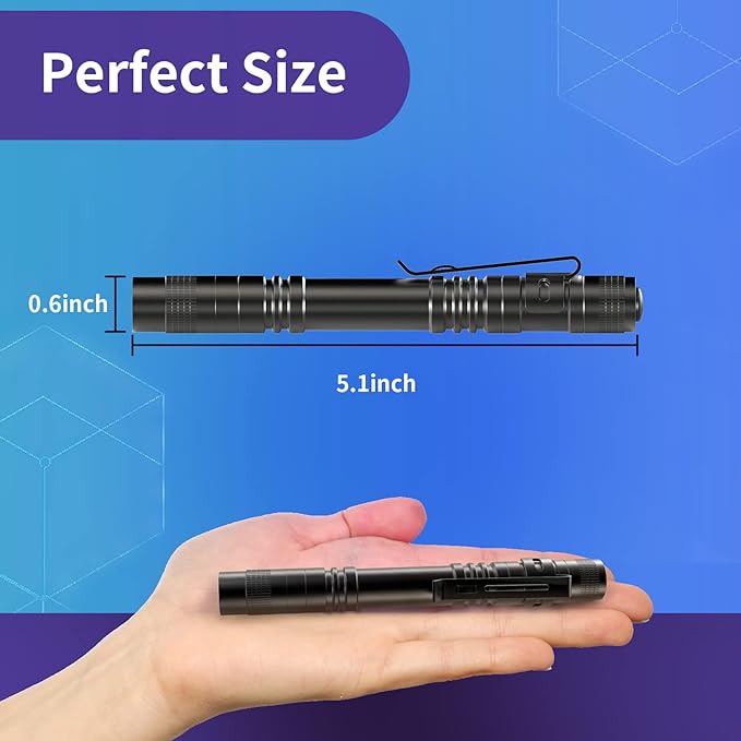 - ▶【LIGHTWEIGHT & METAL CLIP】Measure in 5.5*1.1*0.8inch, weight only 1.1oz/pcs, is extremely lightweight for daily use. With the removeable metal clips, this LED pen light can be easily attached to your belt, pocket, bag or hat, take it anywhere you go. Free your hands when doing works or repairing.