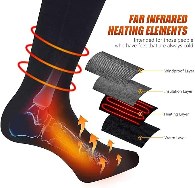 - 🌞【Safe Heating Covers Whole Foot】: Heated socks for men women use far infrared heating elements can be heated quickly, to stimulate your blood circulation, providing you with enough foot warmth in the cold winter, greatly relieving stiff joints, arthritis, foot discomfort, etc. caused by the cold environment, and maintaining comfort throughout the day. The battery has a charge, discharge, and short circuit protection to prevent all safety hazards.