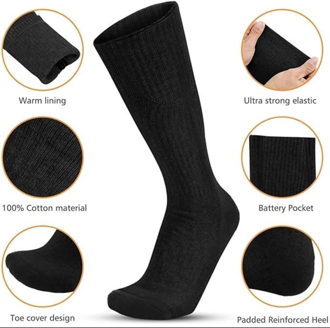 - 🔥【Soft Comfortable & Warm Heated Socks】: This Heated Socks Made from high-quality cotton, with excellent softness, breathability, elasticity and water absorption, thickened design, reinforced heel and toe, durable and very comfortable, perfectly wraps your feet. Prevent your feet from getting cold. Suitable for all kinds of outdoor activities, such as skiing, fishing, hunting, cycling, walking dogs, snowboarding, motorcycle, ridinghiking, running, shoveling snow, outdoor working, etc.