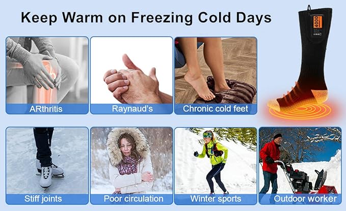- 🔋【Rechargeable Winter Heating Socks】: The electric socks are equipped with 2pcs 3.7V 4000mAh rechargeable lithium polymer batteries, Heating Up to 4-8 Hours. Fully charge the both batteries before first use. The 3 indicator lights turn to blue when complete, about 4-6 hours. People who are bothered by poor circulation and freezing feet can count on these electric socks to keep them comfortable, healthy, and happy while they stay indoor or outdoor.