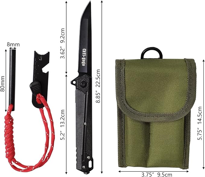 - Magnesium rod 3.15" (8CM) in length and 8MM in diameter. Includes multifunctional metal scraper. Folding knife 8.85"(22.5CM) long. Stainless steel folding knife, sharp and durable. The handle surface is made of mesh anti-slip ABS material.ing knife is 8.85"(22.5CM) long.