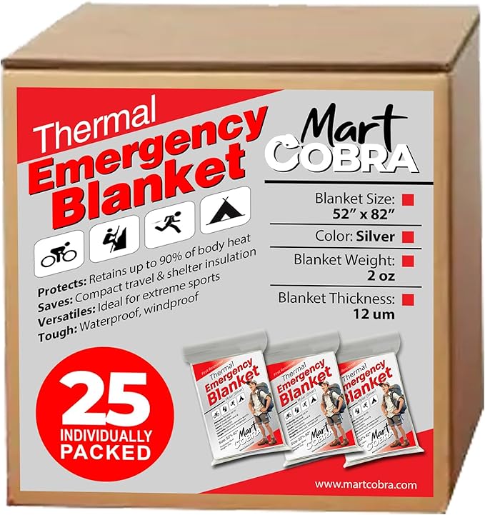 Emergency Blankets for Survival Gear and Equipment x25, Space Blanket, Mylar Blankets, Thermal Blanket, Survival Blanket, Survival Kits Emergency Kit, Emergency Supplies, Foil Blanket Camping Shelter