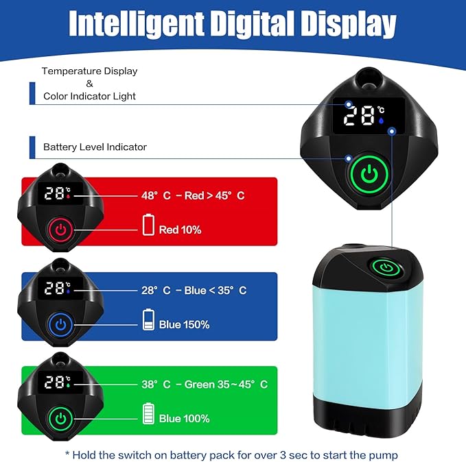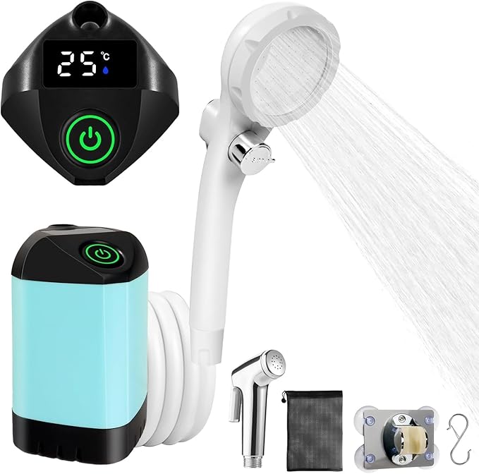 - ✅ Intelligent Digital Display: The portable camping shower pump comes with a intelligent digital display that not only clearly shows the temperature of the water in the bucket, It also has a color indicator light. When the water temperature is 35-45℃, the indicator light is green; When the water temperature is below 35℃, the indicator light is blue; When the water temperature is higher than 45℃, the indicator light is red.