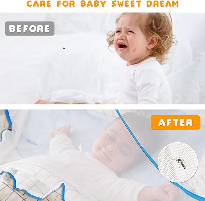 • 【Easy To Use】 No installation required, out-of-the-box. When you take it out of the bag, the pop up mosquito head net will automatically take shape without any installation operation. The mosquito net covers only the head and is recommended with a quilt. It can also provide full body protection to children up to 70 cm from mosquitoes
