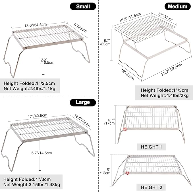 - 【2 Heights Available】This foldable backpacker camping grill mesh has 2 holes on every side, this design provides us 2 heights available which are 6.3”/16cm and 4.7”/12cm. Choose different holes to adjust the height.