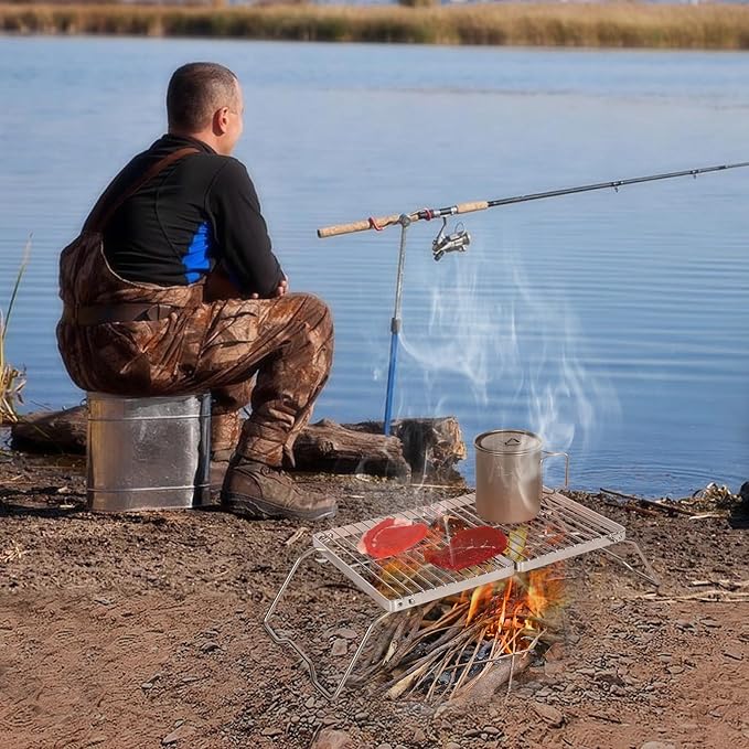- 【Multi-Purpose Campfire Grill】The bushcraft grill is suitable to use over open fire, charcoal, gas or camping stove. Make delicious outdoor feasts, boil water, and brew coffee over a campfire on top of this freestanding backpack camp grill.