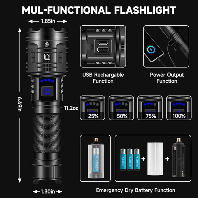 - LED Flashlight Rechargeable: Equipped with an upgraded 5000mAh battery, tactical flashlights high lumens can work for 12hours after fully charged. There are fast-charging Type-C port to ensure high efficiency charging for led flashlight. And four power indicators assist you to know the battery level of the rechargeable flashlight.