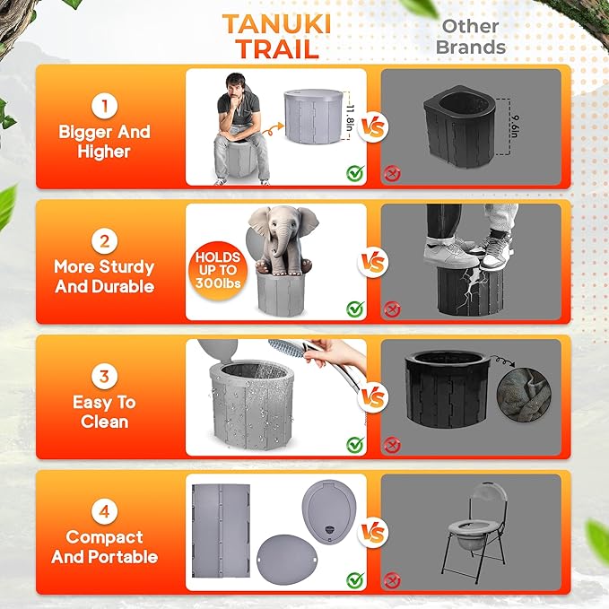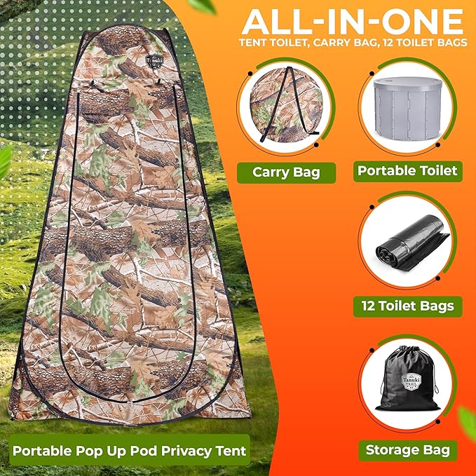 - 𝗖𝗼𝗻𝘃𝗲𝗻𝗶𝗲𝗻𝘁 𝗢𝘂𝘁𝗱𝗼𝗼𝗿 𝗦𝗼𝗹𝘂𝘁𝗶𝗼𝗻: Revolutionize your outdoor escapades with the Tanuki TRAIL portable potty along with the added camping toilet tent. This versatile kit ensures unmatched convenience whether you're camping, embarking on road trips, trucking, boating, or facing unforeseen emergencies. Embrace the freedom to explore without bathroom worries