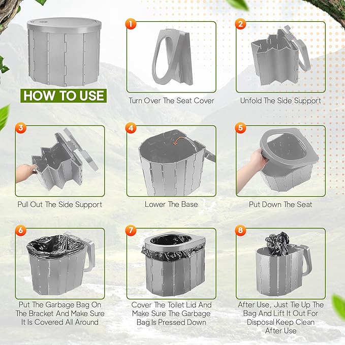 - 𝗩𝗲𝗿𝘀𝗮𝘁𝗶𝗹𝗲 𝗨𝘀𝗮𝗴𝗲: From camping to road trips, trucking to boating, and even emergencies, this camper toilet kit is the ultimate solution for outdoor enthusiasts. Its versatility and convenience make it ideal for adventurers of all kinds, ensuring you're prepared for whatever nature throws your way
