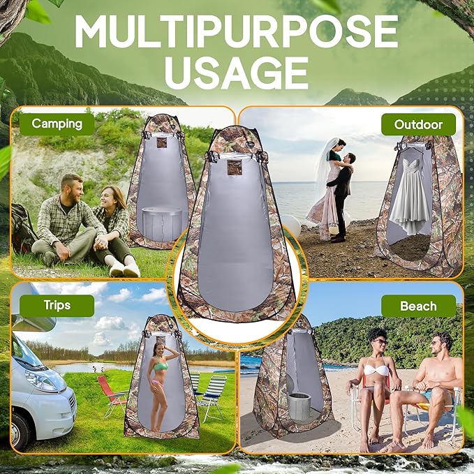 - 𝗜𝗻𝘀𝘁𝗮𝗻𝘁 𝗣𝗿𝗶𝘃𝗮𝗰𝘆: Enjoy instant privacy anywhere with the included privacy tent for portable toilet. Whether you're camping under the stars or embarking on a long road trip, the privacy tent offers discreet comfort for answering nature's call. With ground stakes and fixing ropes included, you can rest assured knowing your privacy will be protected, even in windy condition