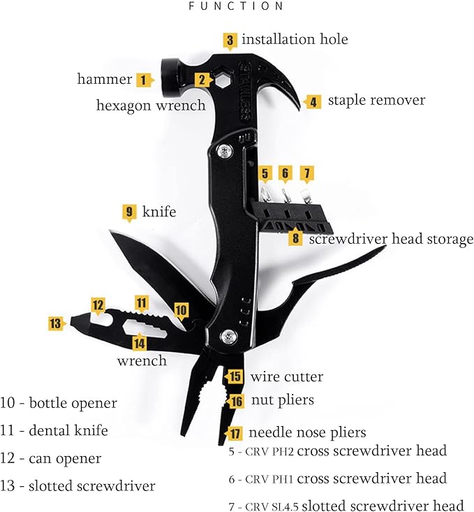 - Easy to carry: Equipped with a free belt storage bag to ensure safety and convenient access. Ergonomic and portable multifunctional 14-in-1 handy tool can meet all the needs of daily repair tools: hammering/ cutting/ installing/ tightening/ opener/ wrenching/ liftering.