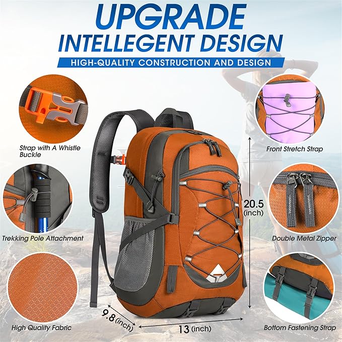 - 【Upgraded Wet Pocket Design】The lightweight hiking backpack stands out with a more user-friendly design that is easy to use. A waterproof wet pocket has been added on the back,and a zipper on the back leads to an internal wet pocket for better separation of sweaty clothes, towels or other personal items after exercise.Effectively separate the items in the water resistant hiking backpack wet and dry.