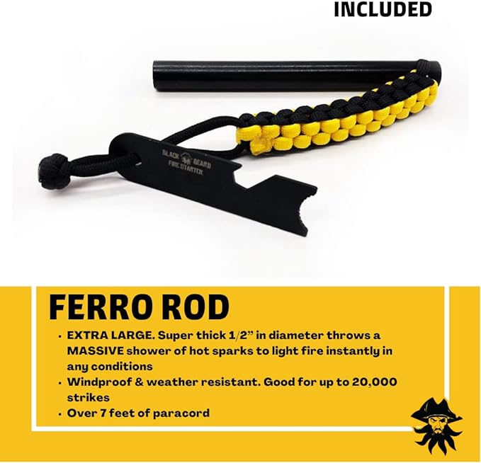 - Ferro Rod - Rain, wind or shine, the fire starter sparks in all weather, at any altitude throwing massive shower of 5000-degree sparks to light fires instantly and best paired with the Black Beard Fire Plugs (Included)