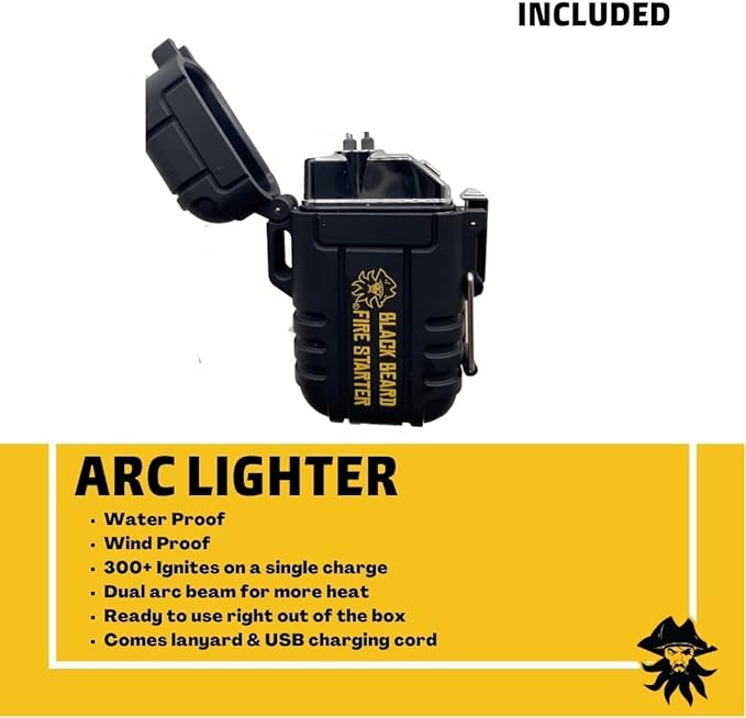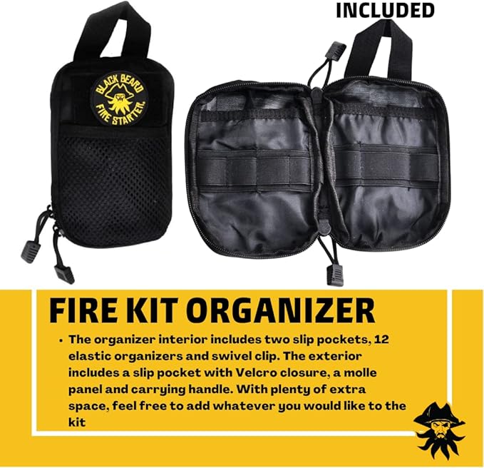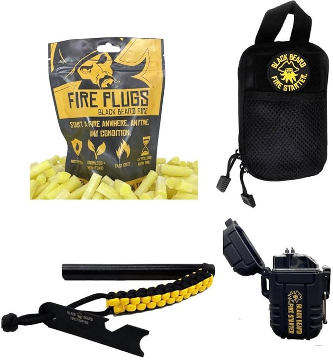 - Included Components : 50 Fire Plugs, Ferro rods, Arc Lighter, Organizer Case and Black Beard Patch