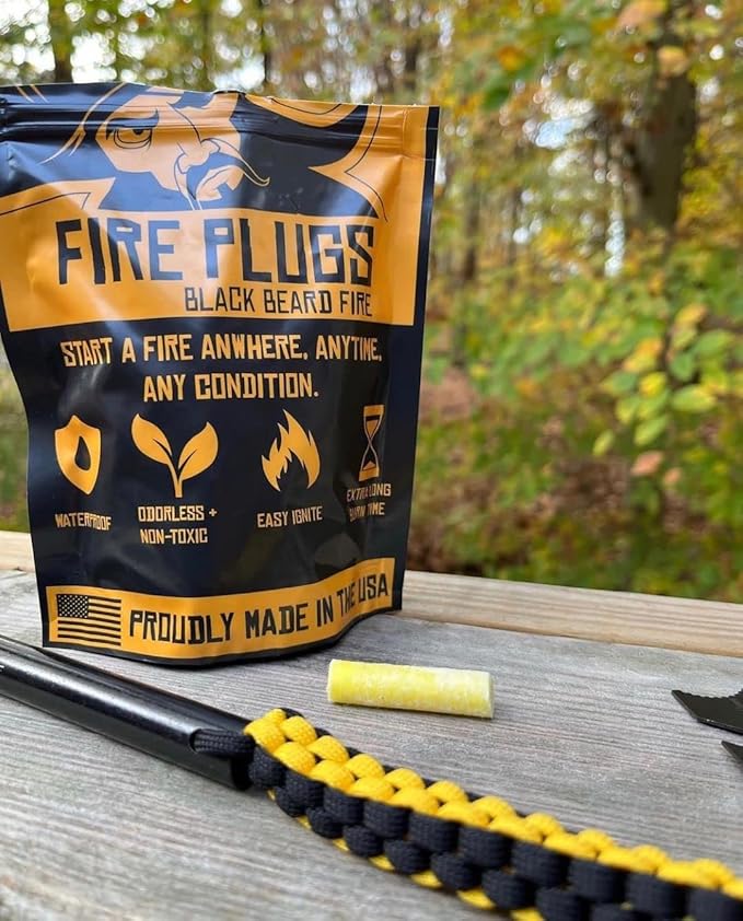 - Fire Plugs - Waterproof, windproof and failproof, bag of plugs can withstand extreme conditions, light 50+ fires, burn over 4 hours, and will never evaporate, deteriorate, or dissipate, designed to light up every time