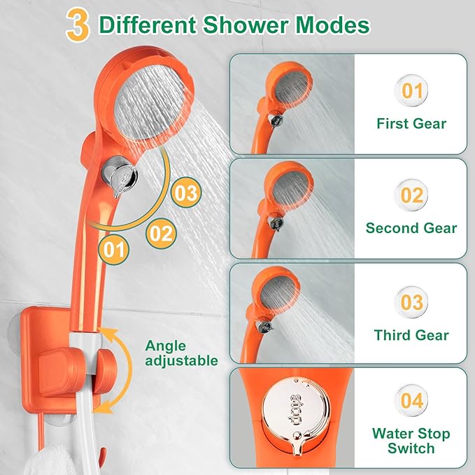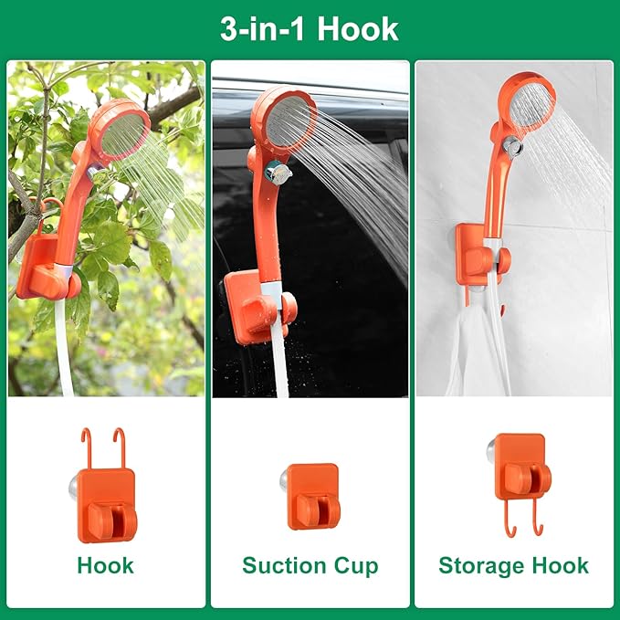 - ✅ Compact and Portable: Portable shower kit weights only 2.3LB, mesh storage bag, convenient to carry and store. Provided suction cup can fix the shower head on any smooth flat surface. Hook lets you hang the showerhead safely on trees for a convenient shower.