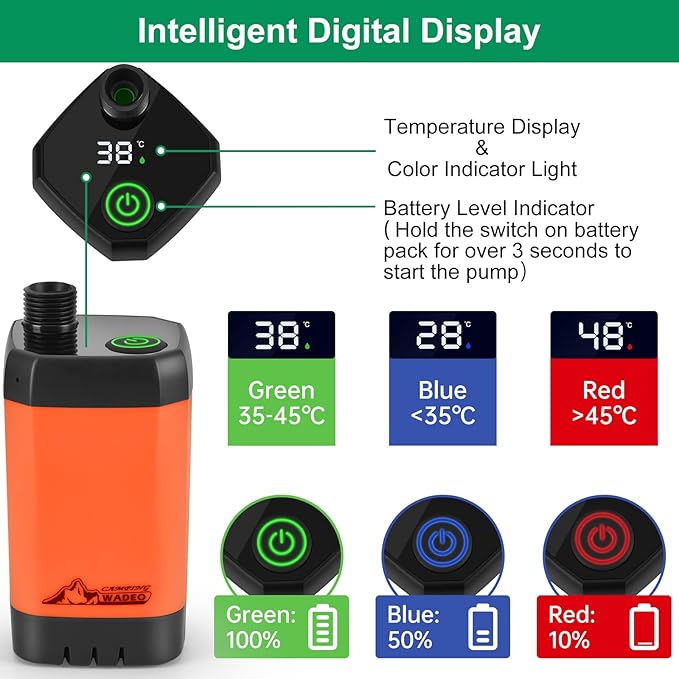 - ✅ Intelligent Digital Display: Real-time power level display: Green light indicates full power, blue light indicates medium power, and red light indicates low power to help clearly understand the power status; Real-time water temperature display,applicable range 32-140°F, water temperature is 35-45℃, the indicator light is green; water temperature is below 35℃, the indicator light is blue; water temperature is higher than 45℃, the indicator light is red.