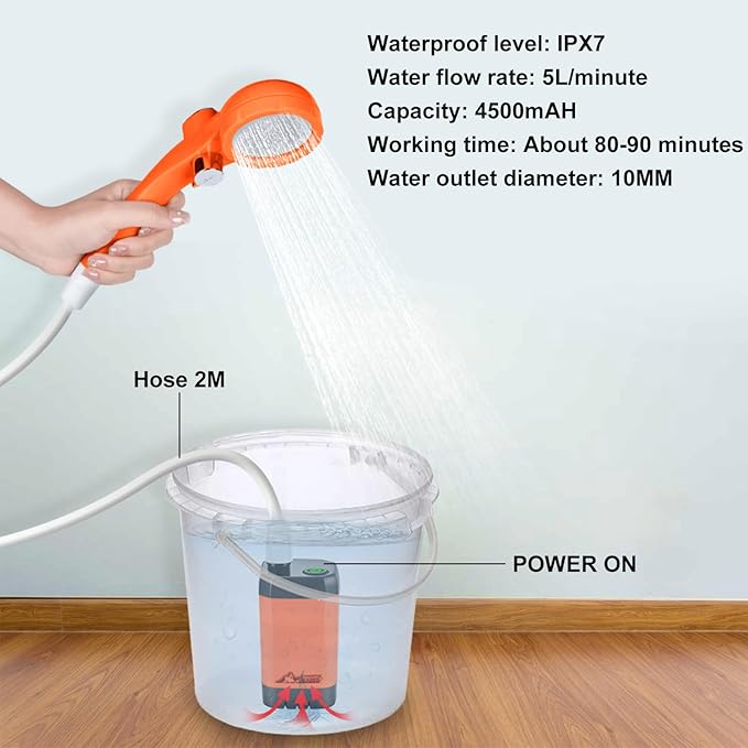 - ✅ Easy Assembly and Operation: WADEO camping shower is very easy to use, hold the switch on battery pack for over 3 seconds to start the pump. Equipped with a 3 selected modes shower head and water stop switch, you can easily switch different modes by rotating the handle on the shower head panel. The camping shower offers gentle and comfortable stream at 1.32 gal/min (5 L/min).