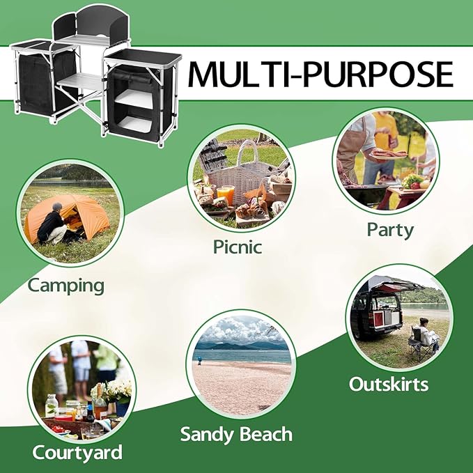 CampLand Folding Cooking Table Outdoor Portable Cook Station Aluminum Camping Kitchen with Storage Organizer, Windscreen, Hooks for BBQ, Party (Black2cabinet)