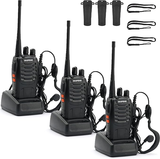 - Radios Walkie Talkies Kit: 3 x Baofeng radios with Original Antenna, 3 x Batteries, 3 x Charger, 3 x Belt clip, 3 x Wrist Strap, 3 x Headset, 1 x User Manual. If you have any questions, our professional team will solve your problems as soon as possible.