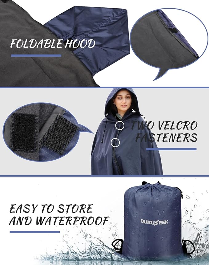 - ✅ 𝗦𝗧𝗔𝗗𝗜𝗨𝗠 𝗕𝗟𝗔𝗡𝗞𝗘𝗧 𝗪𝗜𝗧𝗛 𝗨𝗡𝗜𝗤𝗨𝗘 𝗛𝗢𝗢𝗗𝗘𝗗 𝗗𝗘𝗦𝗜𝗚𝗡:The DUKUSEEK outdoor waterproof stadium blanket for cold weather has an adjustable hood, which can be easily unfolded and converted into a poncho and cloak in rainy days. And it comes with a stuff sack for easy carrying and storage.