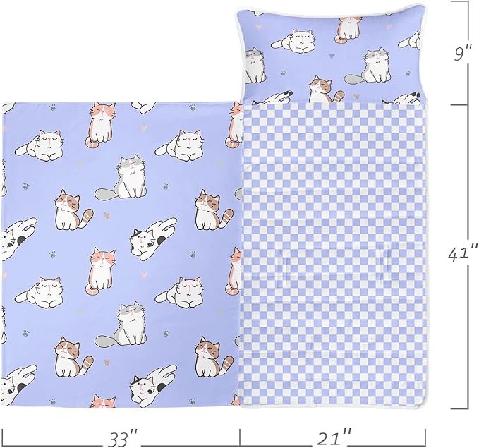 - Size - Nap mat measures 50“x21”x2“, comes with 21”x9" removable pillow. Attached blanket measures 41” x 33”. Suitable for children ages 3 to 7.