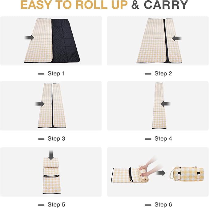 - HIGH QUALITY FABRIC: The top fabric is made of durable polyester, and printed with classic neutral yellow white check, the color printed is safe and fastened, not easy to fade as time goes. The soft cotton padded in the middle, making the picnic blanket soft and comfortable to sit and lie down.
