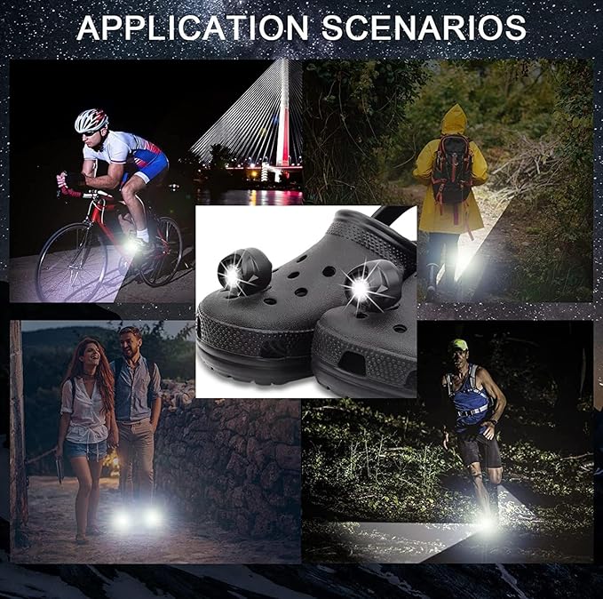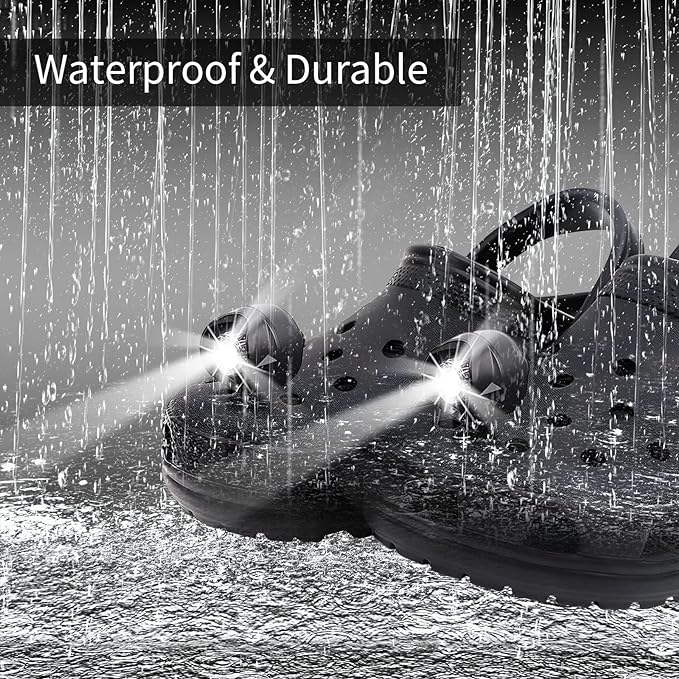 - IPX5 Waterproof and Durable: Ultra bright lights for croc shoes, light up 33 feet away, brighter than phone light. Waterproof design can easily deal with rainstorm weather and the dew of wild camping and improve the product durability