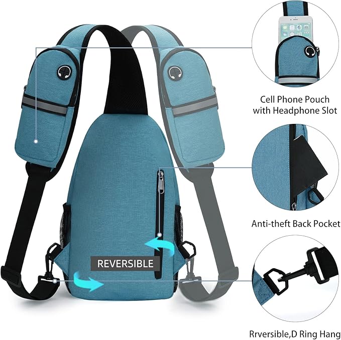 - Unique Design: The sling backpack has a hidden pocket in the back, you can safely store your bank cards or passports, etc., reducing the risk of theft.The shoulder strap pocket is 3.5 x 1.5 x 7.5 inches and can hold a phone up to 10 inches. The shoulder strap pocket has a headphone jack so you can enjoy music anytime, anywhere.This multipurpose shoulder bag is a great travel essentials.