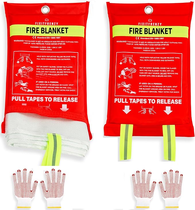 - ✅ COMPLETE SET: Convenient 2-pack fire suppression blanket set including 2 pairs of protection gloves to safeguard your hands against any fiberglass fibers.
