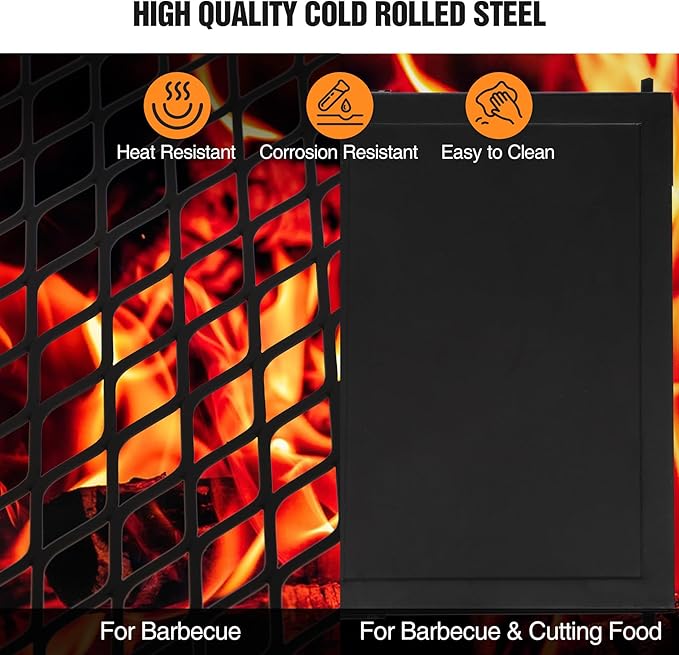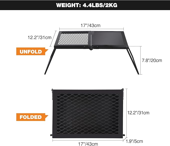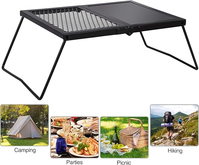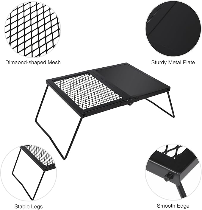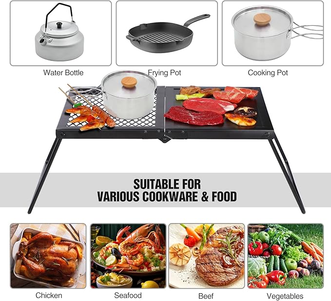 - 2-in-1 Design: The folding camping grill is designed specially with half mesh and half plate. The mesh grill is for barbecue, while the plate can be used to cut vegetables and meat. It can accommodate multiple kettles, pans, and pots.