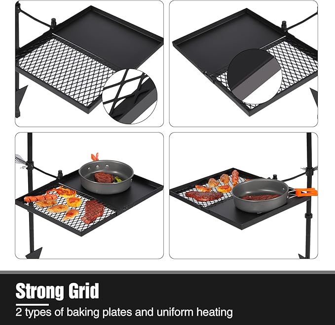 - Premium Material: The grid of swivel camping grill is made of iron with anti rust coating, which is rust-proof, durable and easy to clean after using.