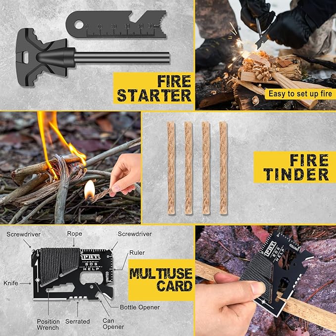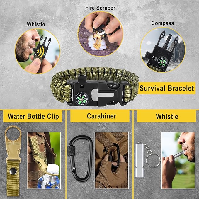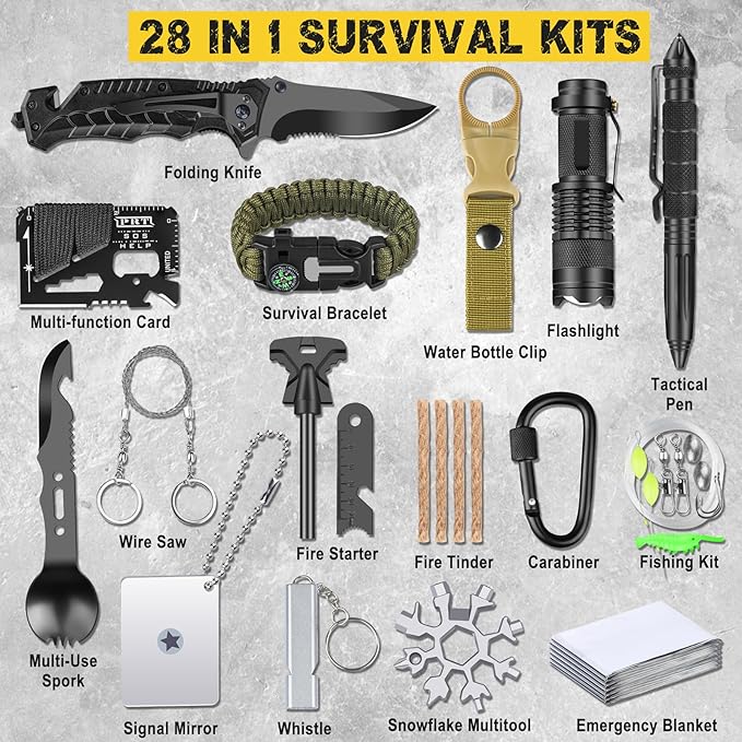- ✨【28-in-1 Camping Survival Gear】NewFation camping survival kits are the complete package that offers unlimited possibilities for any outdoor sports enthusiast. With 28 essential tools included: Flashlight, Wire Saw, Water Bottle Clip, Emergency Blanket, Flint Stone Scraper, Credit Card, Multi-use Spoon Fork, Snowflake Multitool, Signal Mirror, Fishing Kit, Carabiners and Waterproof Box. You'll be well-prepared for any adventure or emergency situation.