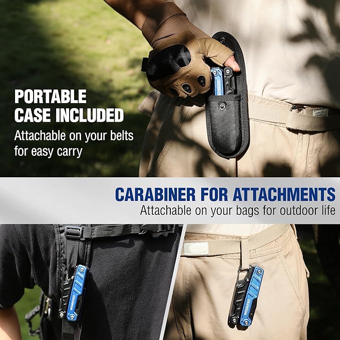 - Portable Sheath and Pocket Clip - When go outside for working, camping, or hiking, simply grab the pocket multitool and place it in the nylon sheath, which is attachable to your belt or bag. Or just easily attch the multi tools to your pocket.