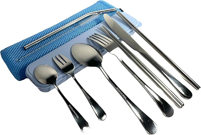 - PORTABLE: Designed in USA, this cutlery set with 11 pcs contains dinner knife, fork & spoon, chopsticks, dessert spoon & fork, straight & bent straw, straw cleaning brush, carrying case, and mesh bag