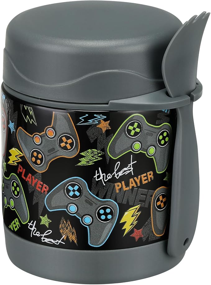 10oz Soup Thermo for Hot Food Kids Insulated Food Jar,Thermo Hot Food Lunch Container, Width Mouth Stainless Steel Lunch Box for Kids with Spoon (Black-Gamepad)
