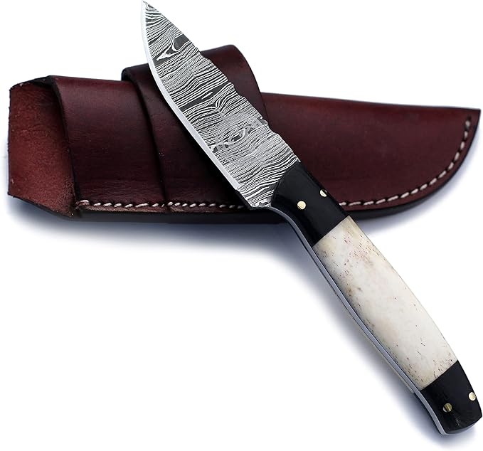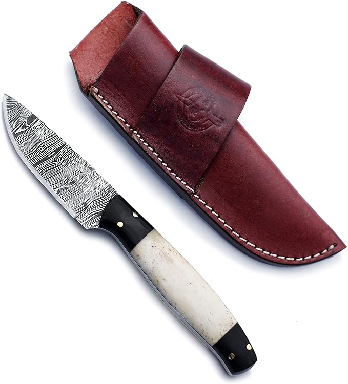 Handmade Damascus Steel Knife Bowie for Hunting,Survival,Camping,Bushcraft and Fishing Fixed Blade withDrop Point-Full Tang Bone Handle with Cowhide-Leather Sheath - WKD-775