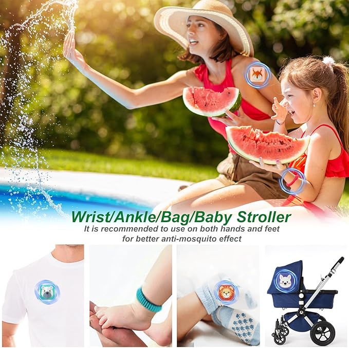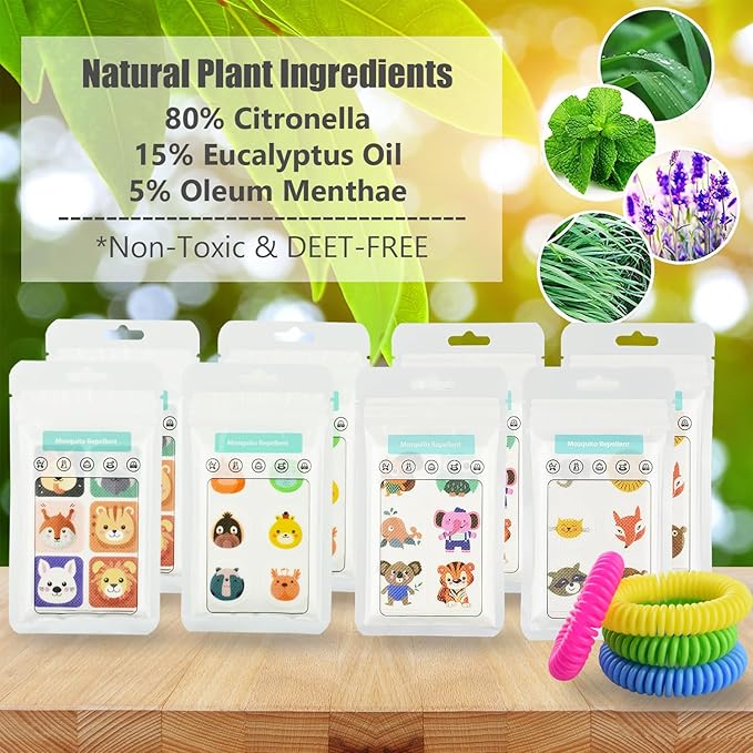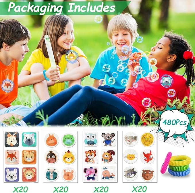 - 480Pcs Mosquito Stickers & 4Pack Bands : Rich stickers and bracelets provide all-round protection, let your family and kids spend a holiday free from mosquito interference. With their compact and portable design, these stickers can be easily applied to any surface. Simply peel off the protective backing and stick them onto your clothing, bags, strollers, hats, or any surface you desire.