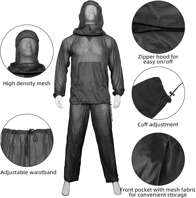 - Zipper on the front makes it easy to reach in and adjust a hat, take a drink or meals without having to pull off the entire head cover. There’re drawstrings to tighten around the wrists and waist and ankles, keeping the bugs out. And Front pocket is large enough to hold tissues, keys, phone or other essential. Wearing with a hat underneath can keep the mesh from sticking to your face.
