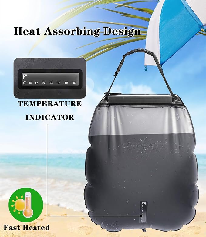 - ★【Heat Absorbing Design】This solar shower bag is made by environmental friendly and leak proof materials which are safe to human health. It heats water to 113°F (45°C) in 3 hours with direct sunlight.It is best to use the water in the outdoor shower bag when the temperature is below 50 degrees to avoid scalding yourself.