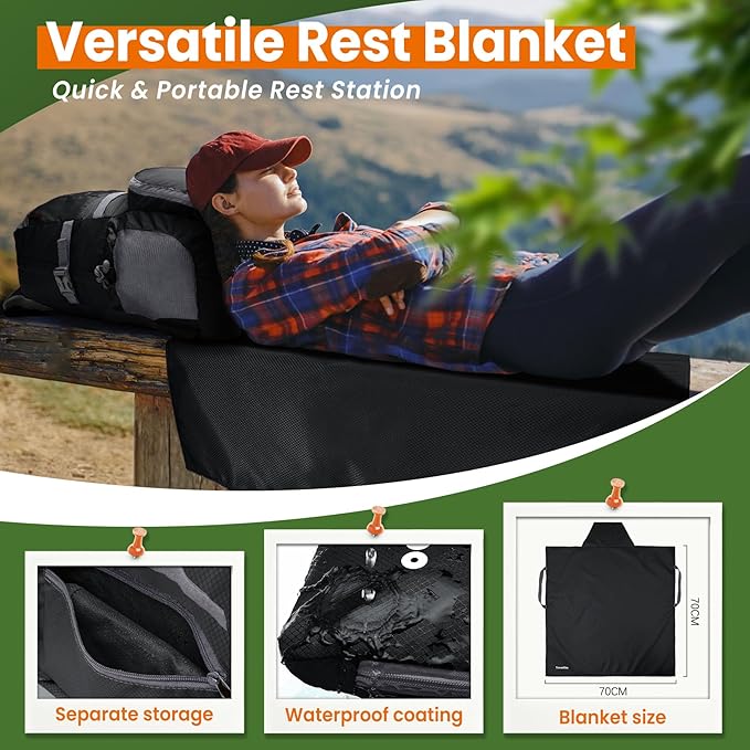 - Versatile Rest Blanket Included:Unpack the rest mat from the backpack and enjoy a comfortable break. The waterproof coating protects against water, dirt, and other elements, ensuring a clean and convenient rest or energy replenishment during your trip