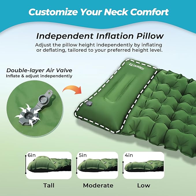 - Adjustable Pillow: The CALMCREST camping pad features an adjustable pillow, allowing you to customize the height to your preference with the easy-to-use valve adjustment button. Enjoy ultimate neck comfort and a restful night's sleep, even in the great outdoors